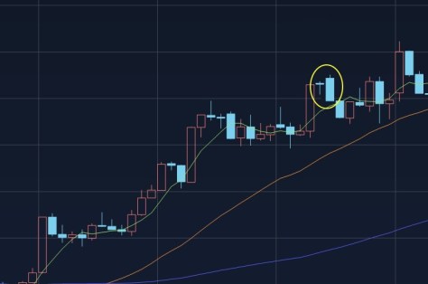 上昇中の過程で陽線が上に放たれると『天井圏』の意味があります。一般的に投資家の間で『宵の明星』と呼ばれます。