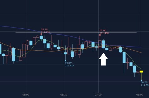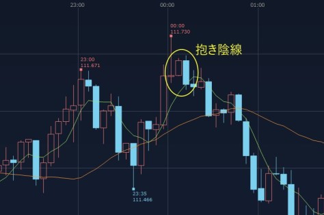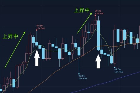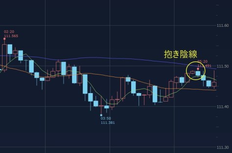 小さな陽線を抱くように陰線が出ると、明確な下げの攻略サインです。下の2つのチャートの黄色い丸で囲んだ二つの5分足が『抱きの陰線』です。