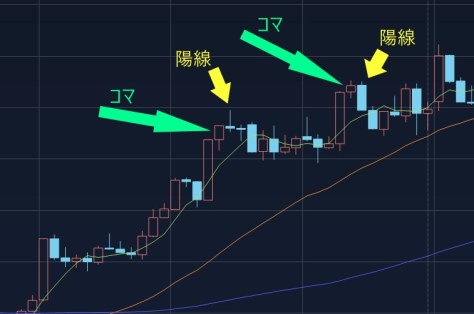 白い矢印が指す二つ目の山の陽線が、攻略のサインです。