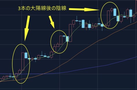 下のチャート上に3か所、『陽のはらみ』の形になってる所を黄色い丸で囲んでみました。